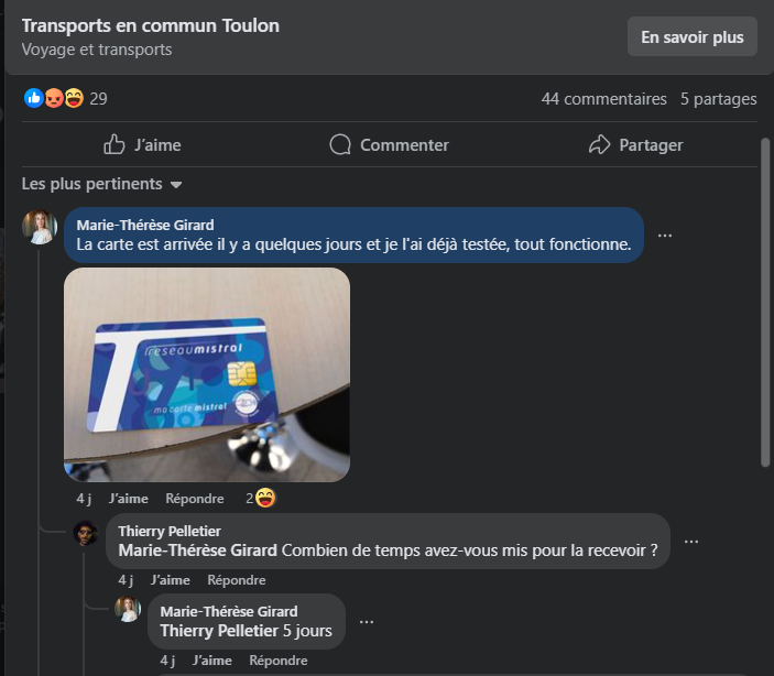 Le seul compte officiel du réseau Mistral est ici : Facebook Réseau Mistral. De plus, nous ne vous contacterons jamais sur Facebook pour vous informer que vous avez gagné une carte de transport sans raison apparente.